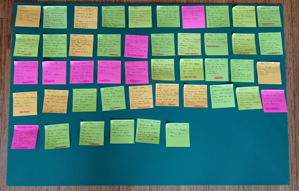I’ve spent the last week re-reading and re-tracking that first draft in readiness for this year’s NaNoWriMo, on a spreadsheet and on this little multi-coloured beauty.